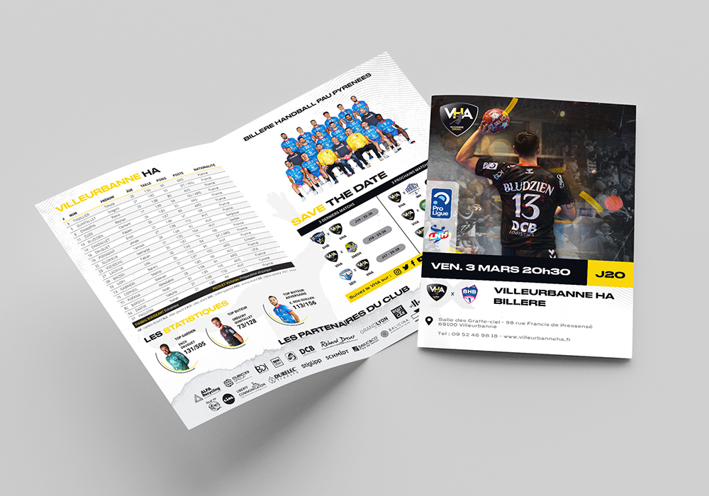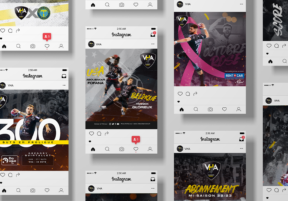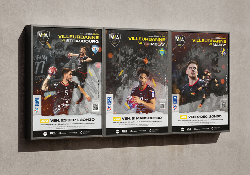 Pendant deux saisons, j’ai accompagné le VHA (Villeurbanne Handball Association) dans la création de tous ses supports de communication, du print au digital, en passant par le merchandising. L’objectif était de renforcer l’identité visuelle du club et d’offrir des visuels attractifs pour les fans et les sponsors.